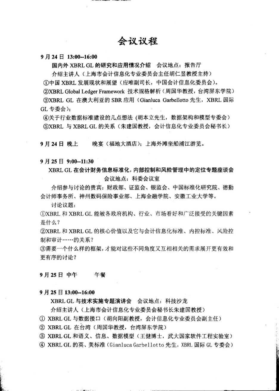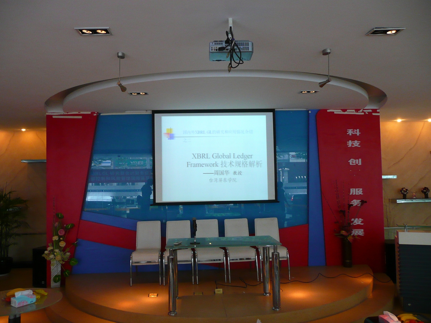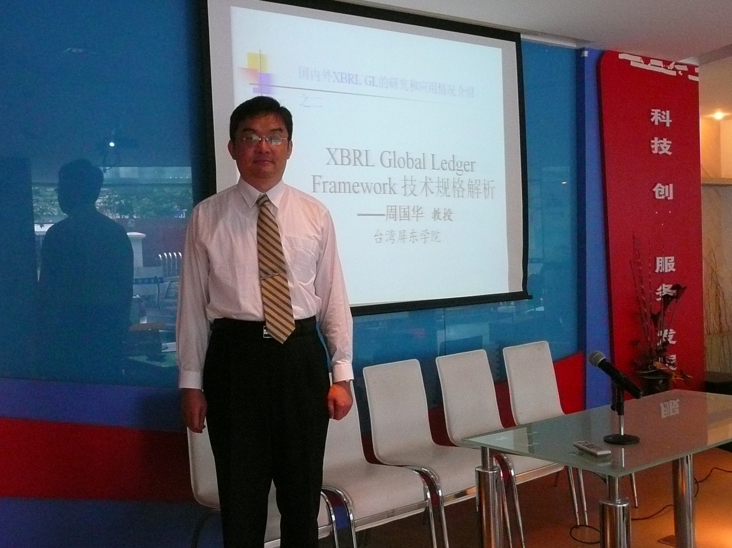 - 周老師應上海會計學會會計信息化委員會邀請,於2009年9月22日至26日赴上海參加第一屆XBRL GL研討會。這次研討會是由上海一批「喝清湯、幹實事」的行動派教授們發起,並有來自北京、安徽、山西、武漢等地區的高校教授參與,本來沒怎麼宣傳,卻取得巨大的成功。北京方面有四個中央部委派主管人員與會(財政部會計司、證監會、銀監會、國家標準研究院),並有來自銀行、事務所、軟件企業的人員參與。周老師於抵滬當日並受邀至上海電機學院做了一場會計課程教學及規劃方法的演講。