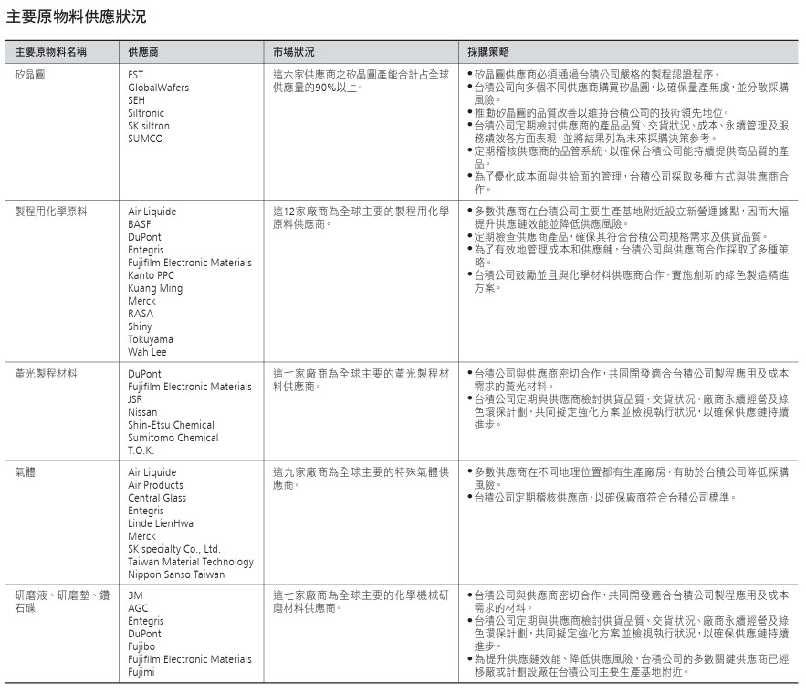 - 參考資料1:台積電主要原物料供應商名單(取材自台積112年報)