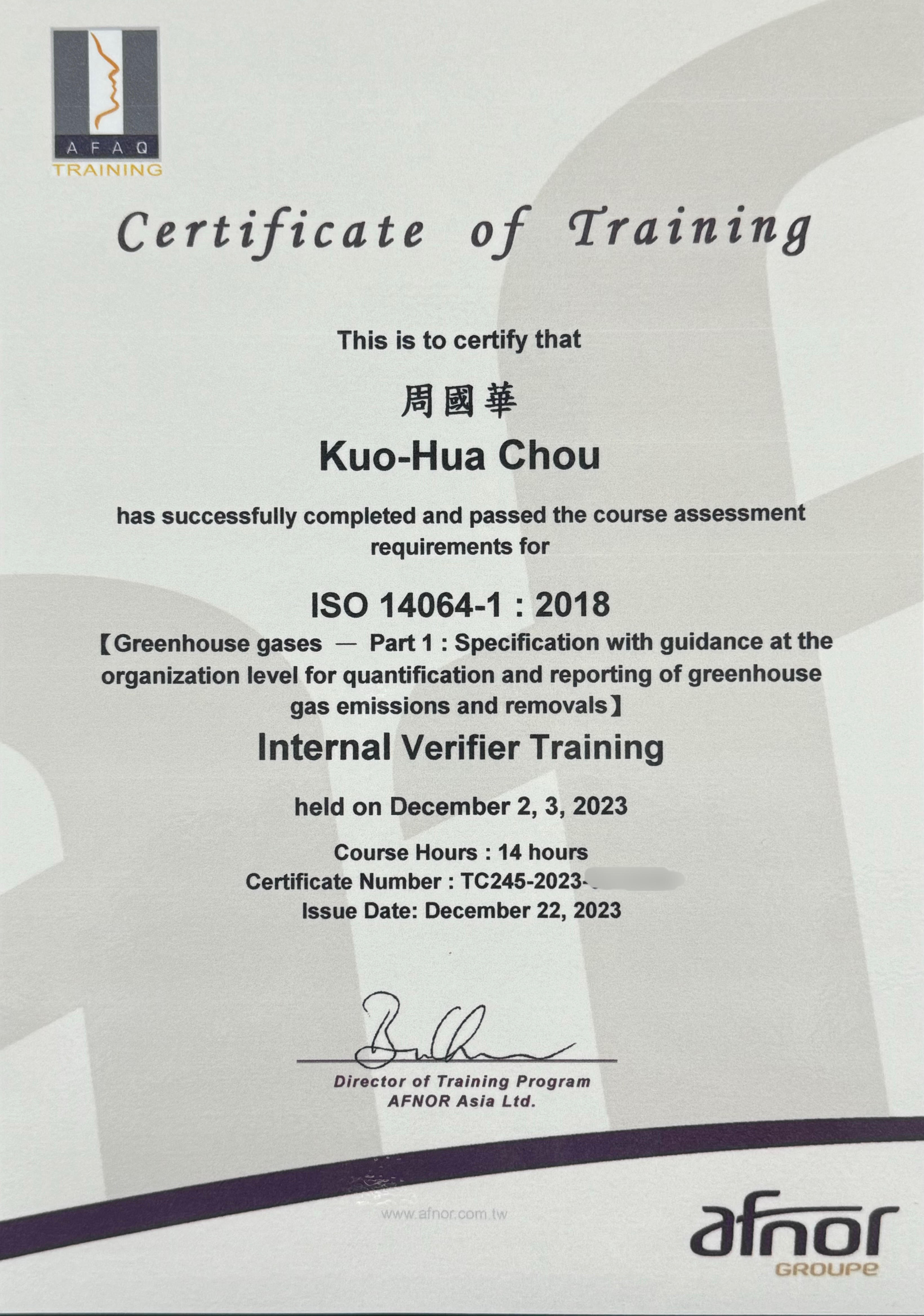 - 2023/12:ISO 14064-1:2018 (組織層級溫室氣體排放與移除之量化及報告規範)(Internal Verifier 內部查證人員) 參考資料